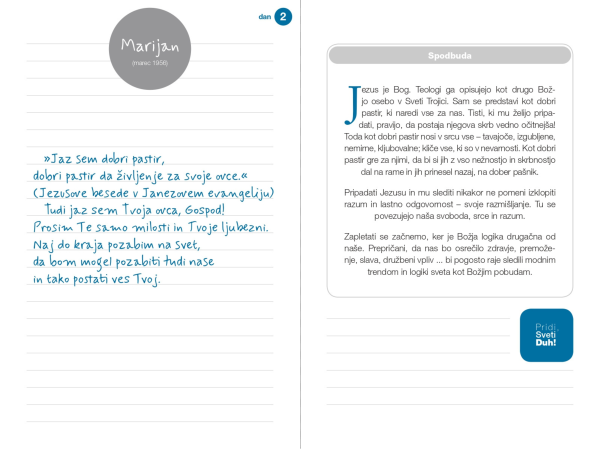 Duhodnevnik je hkrati knjiga in zvezek. Gre za duhovni dnevnik s spodbudami, razmišljanji in prostorom za zapisovanje. Dnevnik vas bo spremljal skozi 49 dni – 7 tednov v sožitju s Svetim Duhom.
