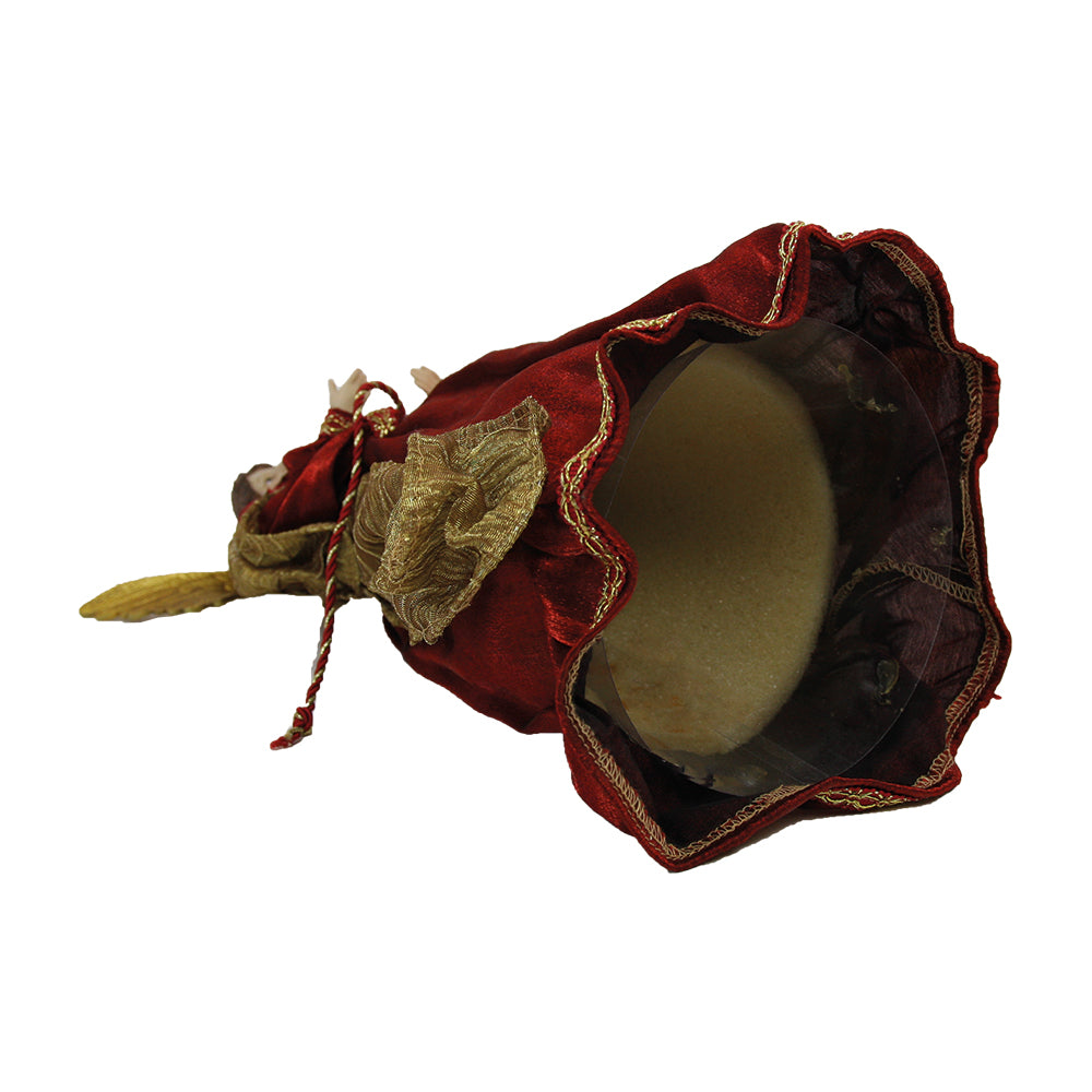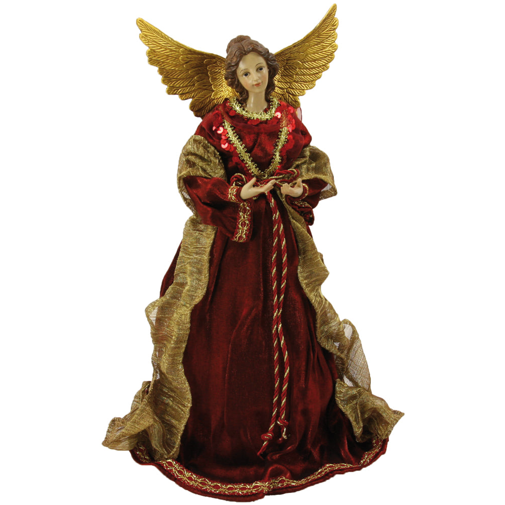 Angel iz umetne mase z obleko iz blaga v rdeči in zlati barvi.