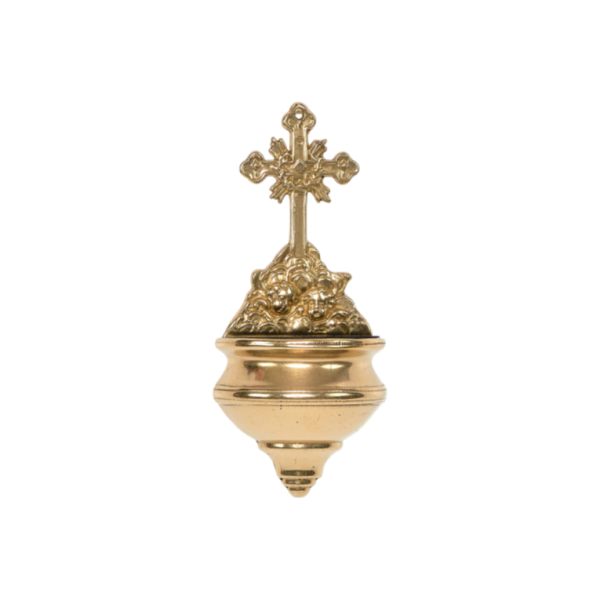 Kovinski stenski kropilnik v velikosti 19 cm. Narejen iz medenine.
