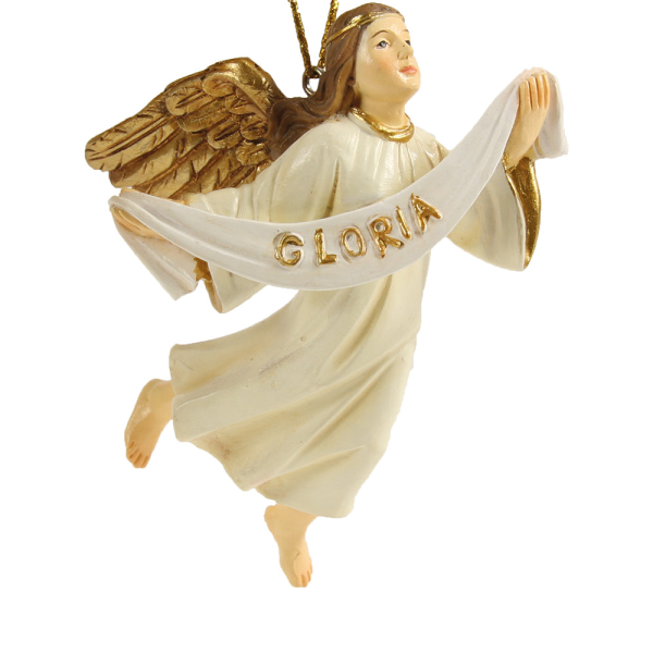 Angel v beli barvi z zlatimi krili in napisom Gloria v roki.