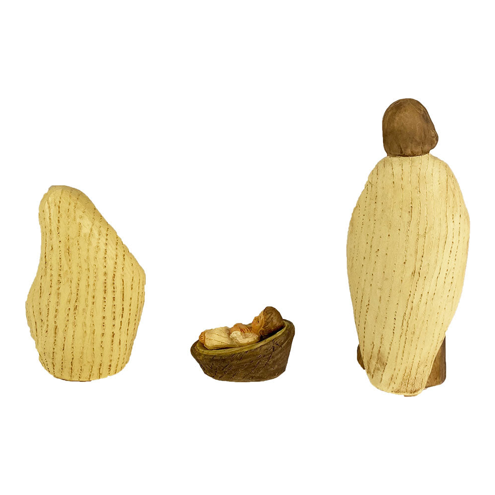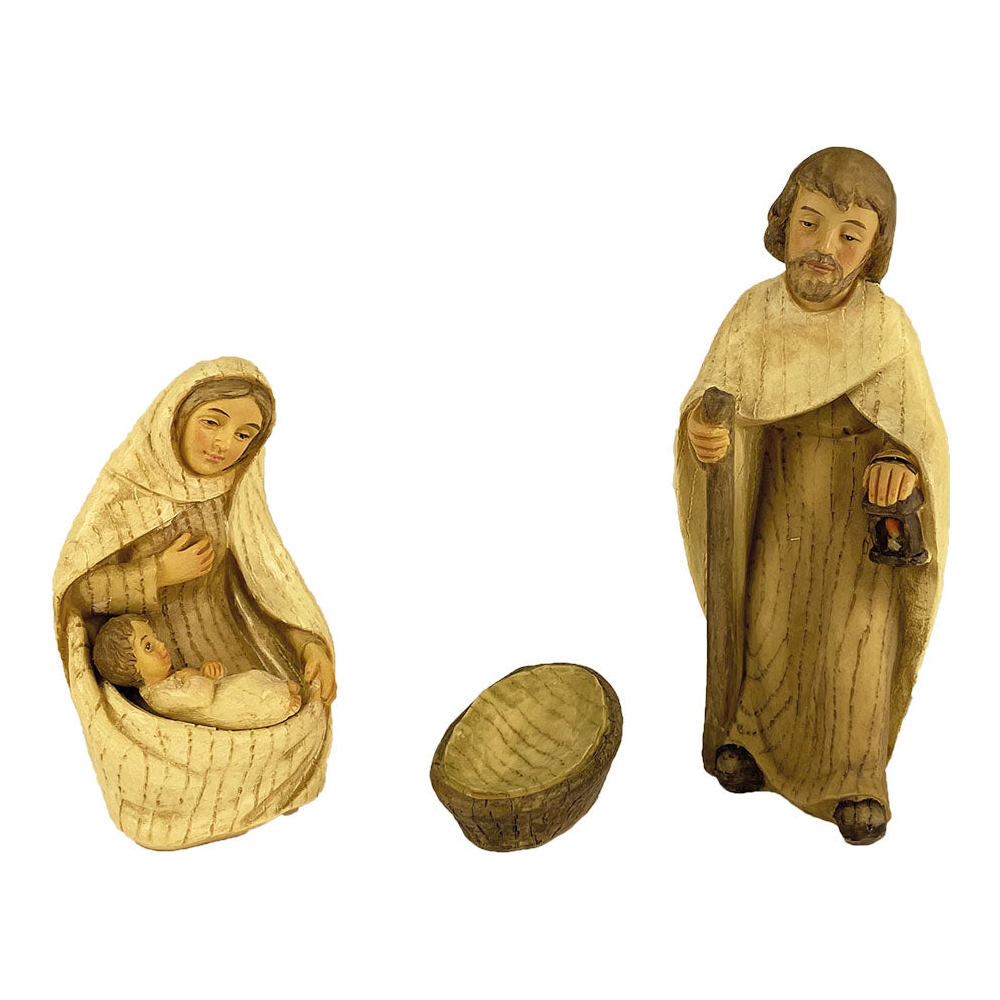Posamezne figure svete družine v velikosti 10 cm. Jezušček je odstranljiv iz posteljice in se ga lahko premakne v Marijino naročje.