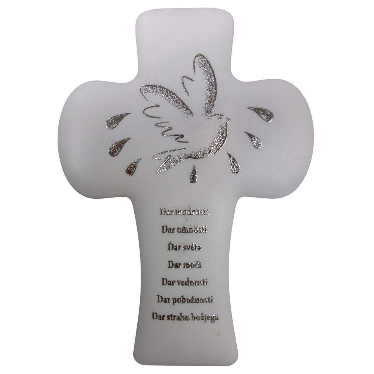 Elegnaten križ v beli barvi poudari svečanost zakramenta, napisi in simboli v srebrni barvi pa opomnijo na darove Svetega duha.