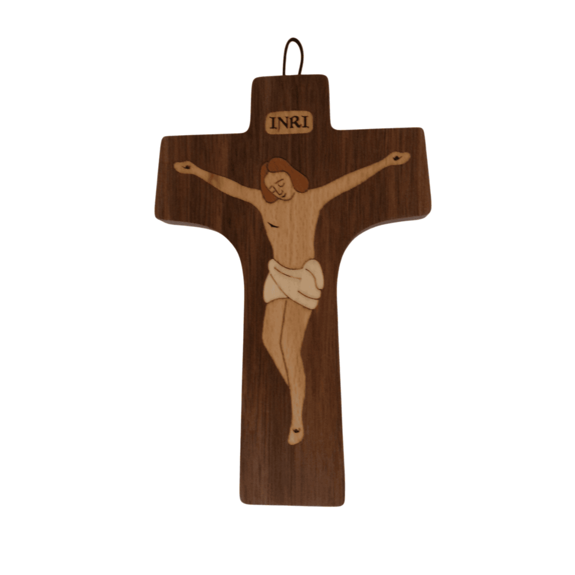 Lesen stenski križ intarzija v velikosti 13,5 cm. Na eni strani je podoba križanega na drugi pa Vstali Kristus.