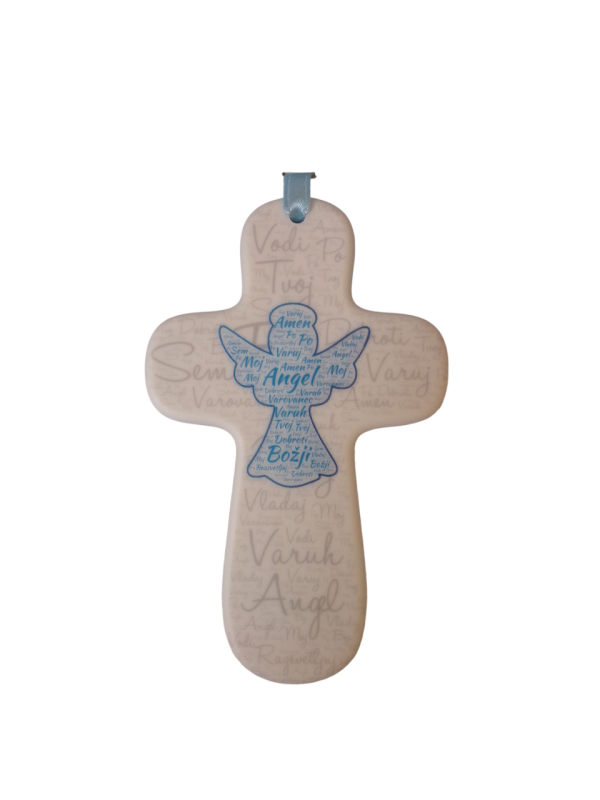 V modri barvi dodana tudi satenasta vrvica s katero lahko križ obesite na steno. Pakirano skupaj s kartončkom z molitvijo k angelu varuhu.