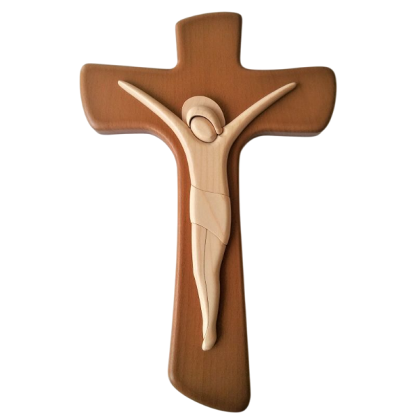Lesen stenski križ v velikosti 28 cm z lesenim korpusom v naravni barvi lesa.