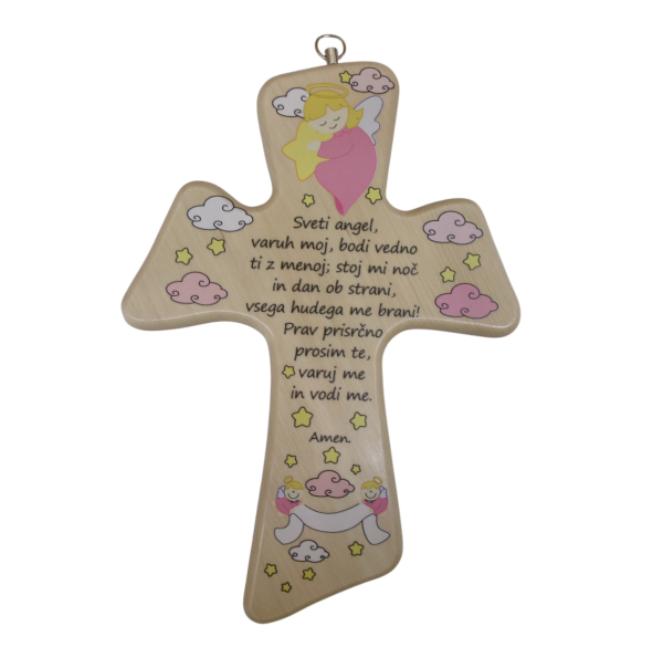 Lesen stenski križ z molitvijo sveti angel v rozni barvi. Primeren za darilo ob rojstvu in krstu.