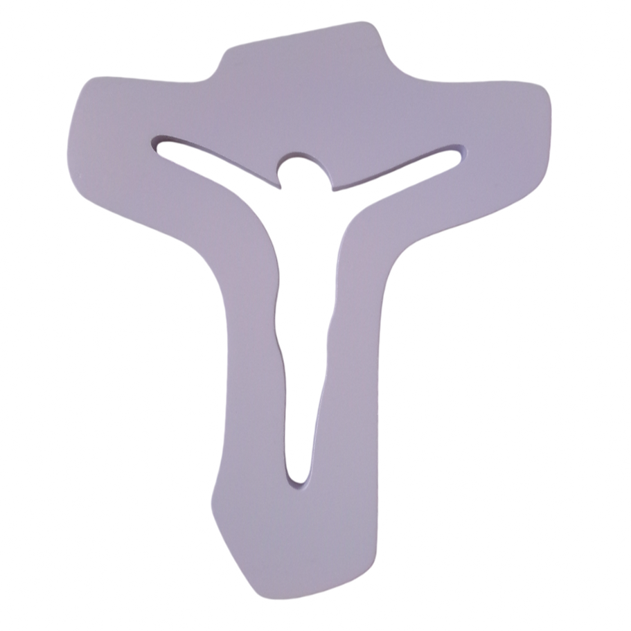 Lesen stenski križ v obliki tau z izrezanim korpusom v vijola barvi. Križ je visok 24 cm.