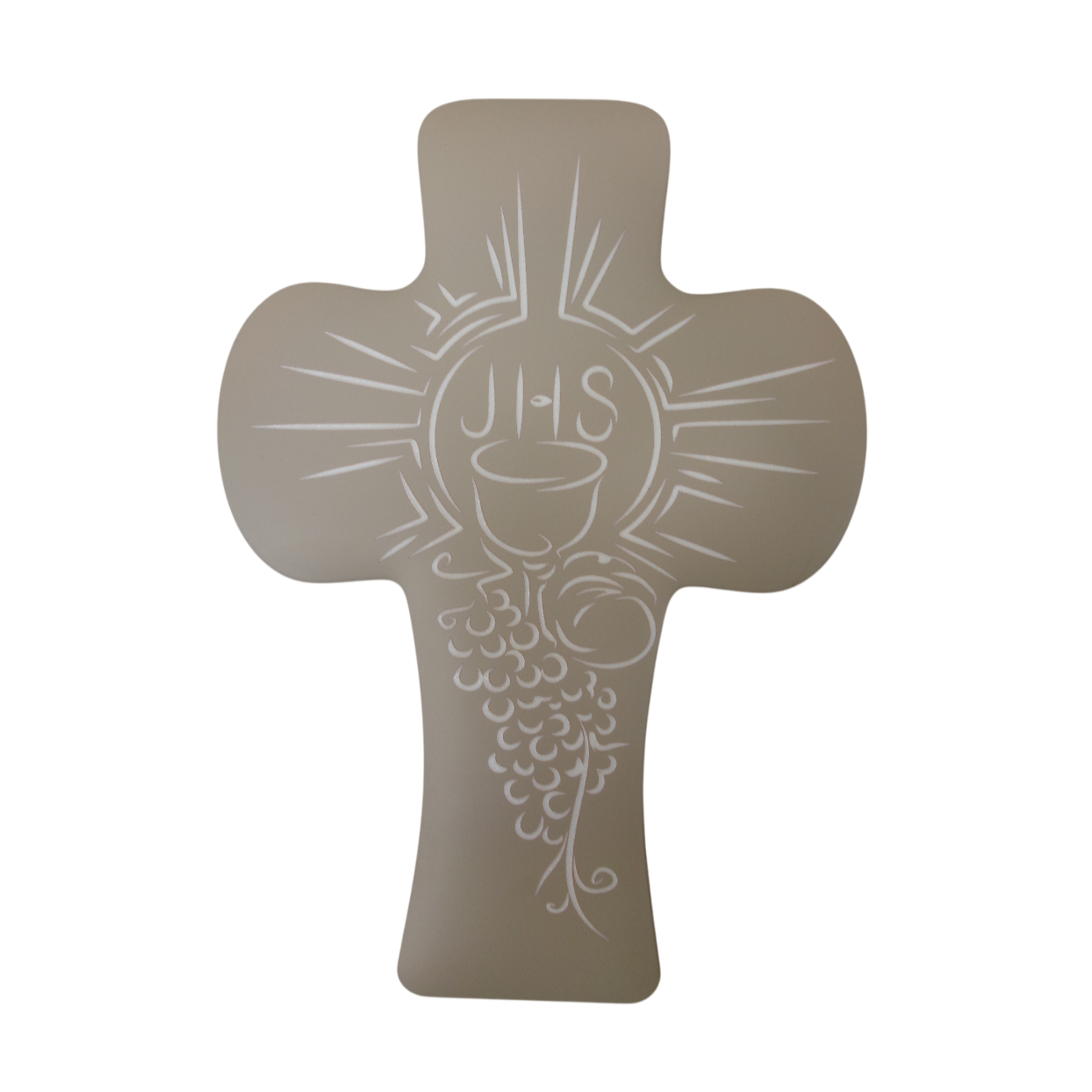 Večji križ primeren s podobo evharistije. Primeren za darilo za prvo sveto obhajilo.