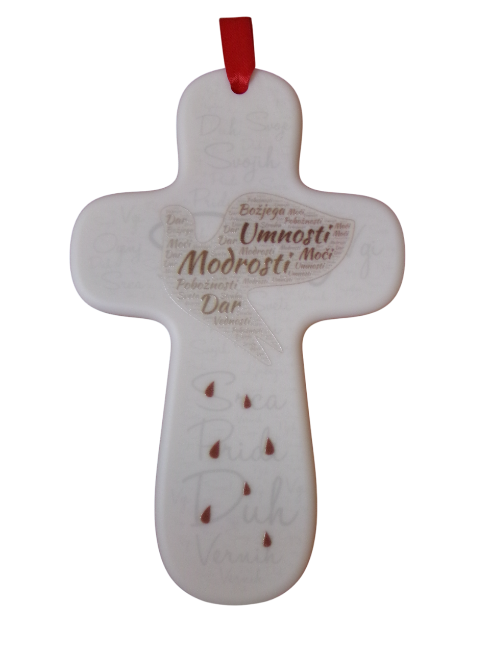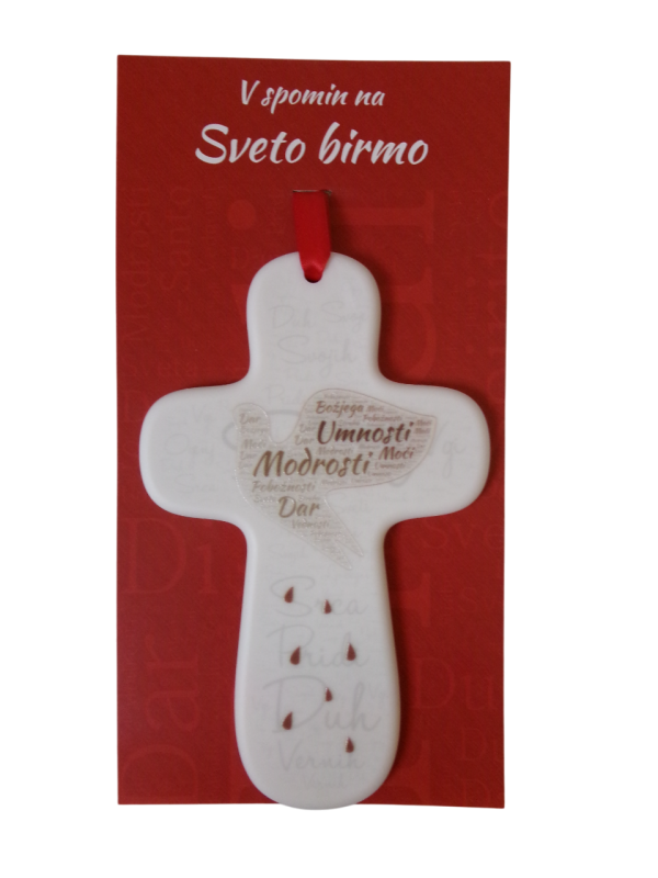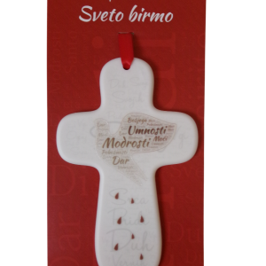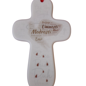 V beli barvi dodana tudi satenasta vrvica s katero lahko križ obesite na steno ali na poljubno mesto. Pakirano skupaj s spominskim kartončkom kamor lahko vpišete ime in datum ter cerkev ob prejemu zakramenta.