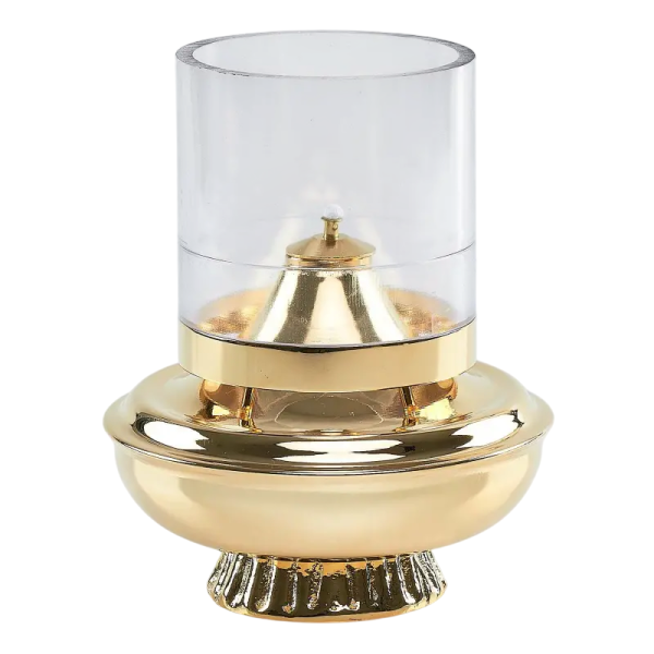 Oljenka iz pozlačene medenine s plastičnim ščitnikom plemena. Višina oljenke je 16 cm, premer pa 12 cm.