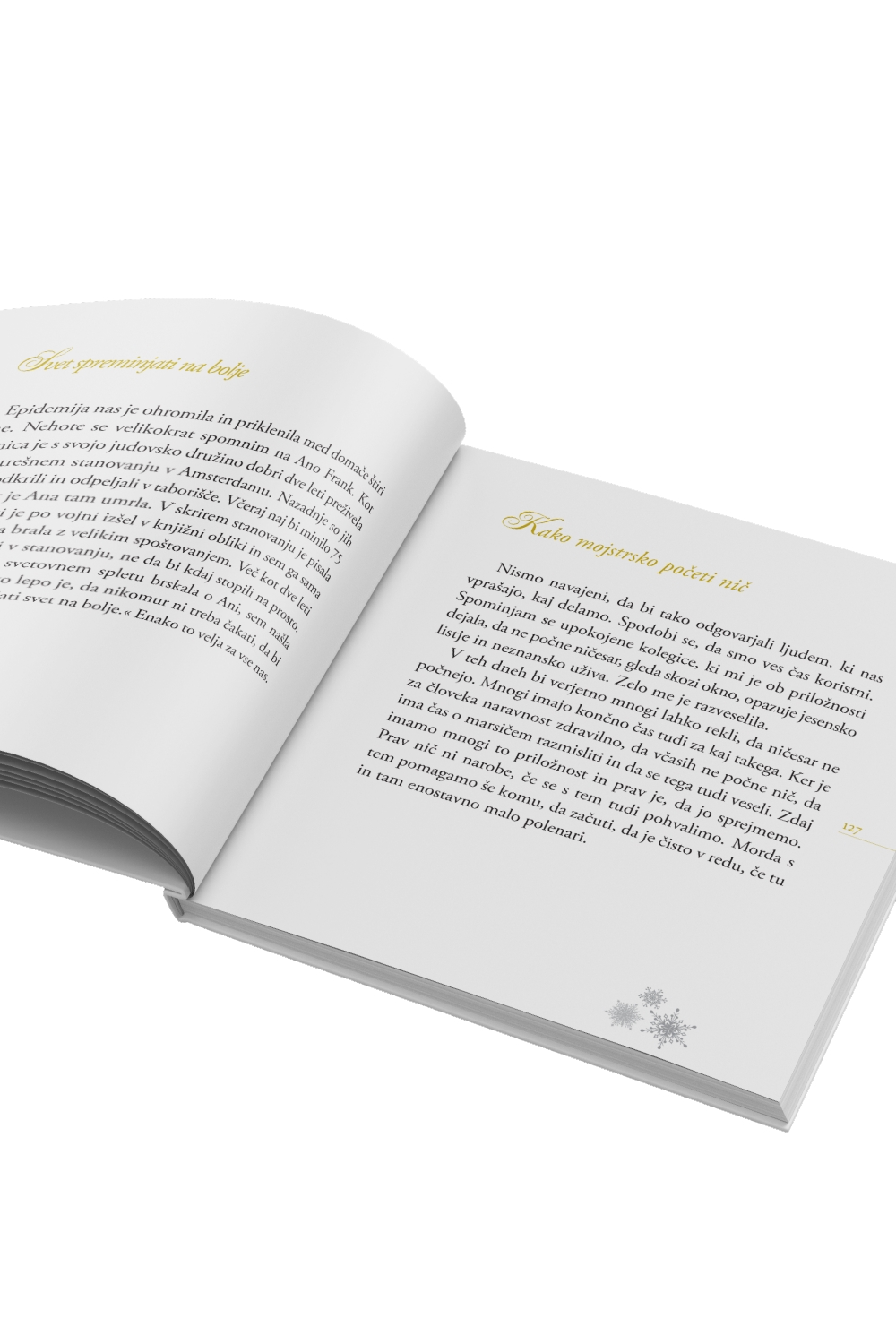 Izbor 160 zapisov iz prelistane knjige obrazov sledi ritmu časov in življenjskih okoliščin, v katerih se prej ali slej znajdemo vsi. Poletje je v znamenju zapisov ali razpoloženj, ko imamo ves svet v dlaneh. Tudi v aktivni dobi, ko lovimo ravnotežje med družino in kariero, se je tu in tam namreč dobro ustaviti in svoj svet prevrednotiti. Ko naš svet poboža prvi dotik večera, se moramo soočiti z omejitvami, izpuščanji in težavami, ki jih prinese jesen življenja. Zima je simbolno čas odhajanja in umiranja. Ko skozi dlani zaveje mraz, se moramo morda soočiti s težko boleznijo, najti besede žalujočemu ali ponovno osmisliti življenje. Utrinki vzporednih svetov izzvenijo vedro in optimistično. Ker na pomlad vedno znova med brsti zazveni harmonija upanja. Avtorica za vsak čas in vsako priložnost najde pravo besedo. V njej se bodo našle vse generacije, še posebej pa tisti z veliko izkušnjami in preizkušnjami.